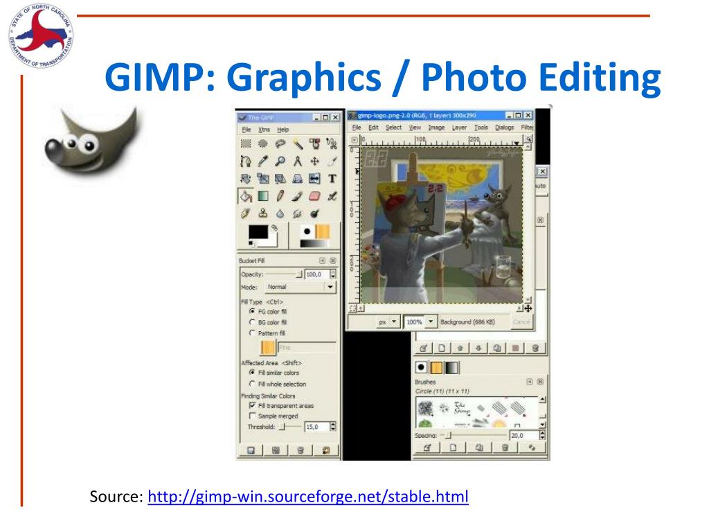 GIMP: Graphics / Photo Editing Source: http://gimp-win.sourceforge.net/stable.html