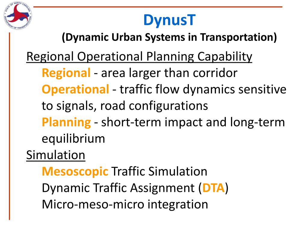 DynusT(Dynamic Urban Systems in Transportation) • Regional Operational Planning Capability • Regional - area larger than corridor • Operational - traffic flow dynamics sensitive to signals, road configurations • Planning - short-term impact and long-term equilibrium • Simulation • Mesoscopic Traffic Simulation • Dynamic Traffic Assignment (DTA) • Micro-meso-micro integration