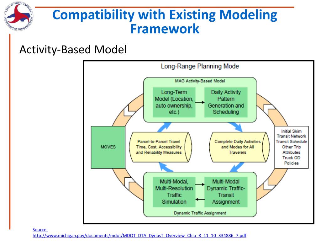 Compatibility with Existing Modeling Framework Activity-Based Model Source: http://www.michigan.gov/documents/mdot/MDOT_DTA_DynusT_Overview_Chiu_8_11_10_334886_7.pdf