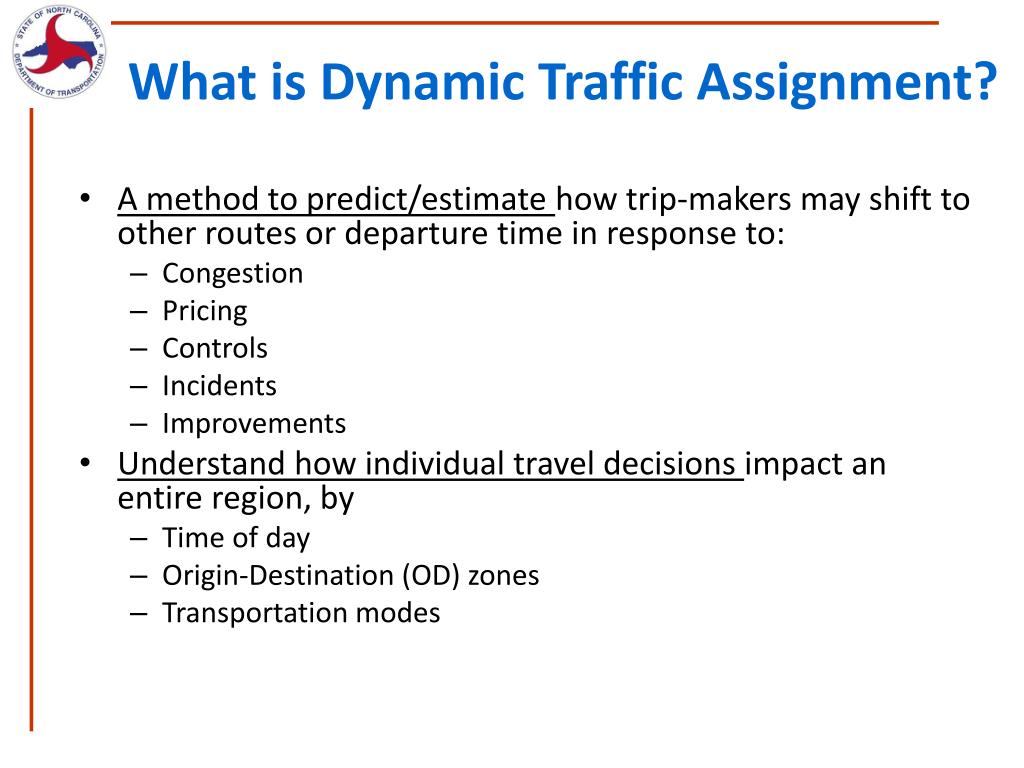What is Dynamic Traffic Assignment? • A method to predict/estimate how trip-makers may shift to other routes or departure time in response to: • Congestion • Pricing • Controls • Incidents • Improvements • Understand how individual travel decisions impact an entire region, by • Time of day • Origin-Destination (OD) zones • Transportation modes