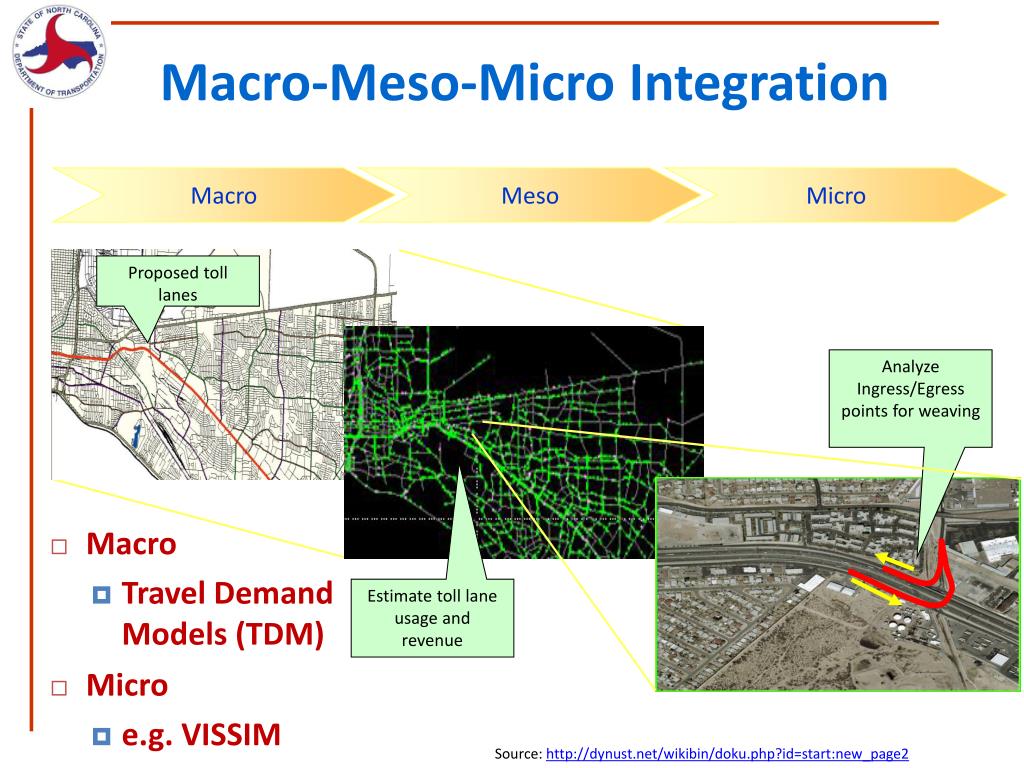Macro Meso Micro Proposed toll lanes Analyze Ingress/Egress points for weaving Estimate toll lane usage and revenue Macro-Meso-Micro Integration • Macro • Travel Demand Models (TDM) • Micro • e.g. VISSIM Source: http://dynust.net/wikibin/doku.php?id=start:new_page2