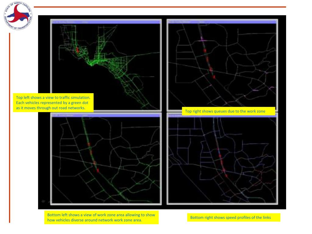 Top left shows a view to traffic simulation. Each vehicles represented by a green dot as it moves through out road networks. Top right shows queues due to the work zone Bottom left shows a view of work zone area allowing to show how vehicles diverse around network work zone area. Bottom right shows speed profiles of the links