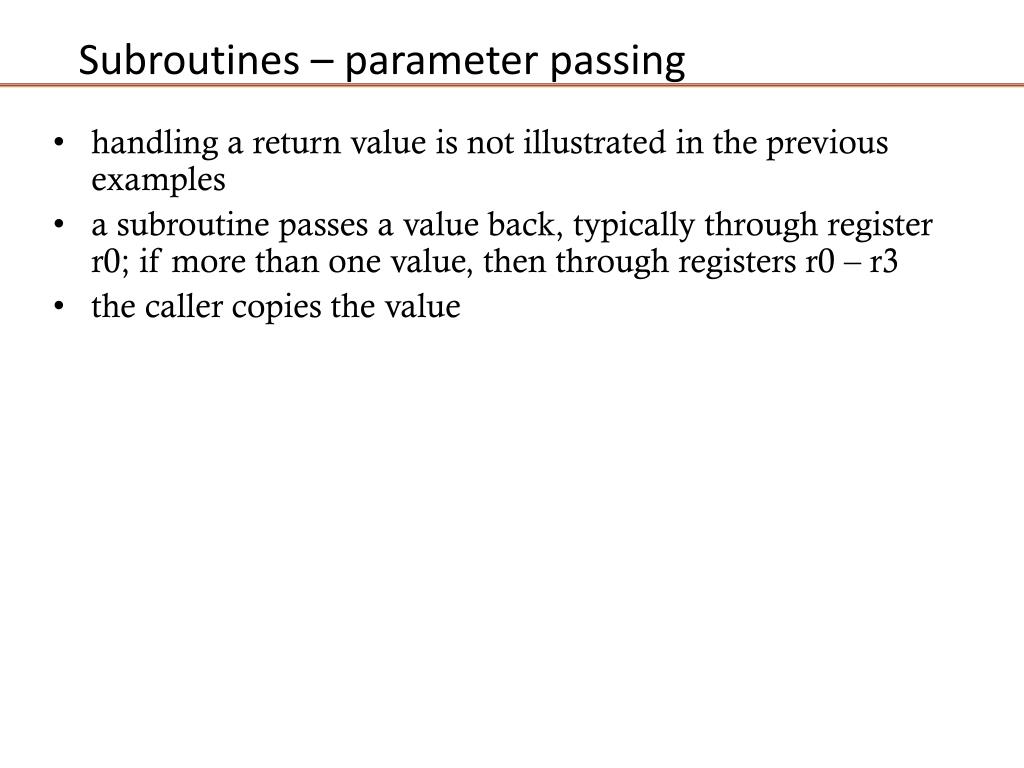Subroutines – parameter passing • handling a return value is not illustrated in the previous examples • a subroutine passes a value back, typically through register r0; if more than one value, then through registers r0 – r3 • the caller copies the value