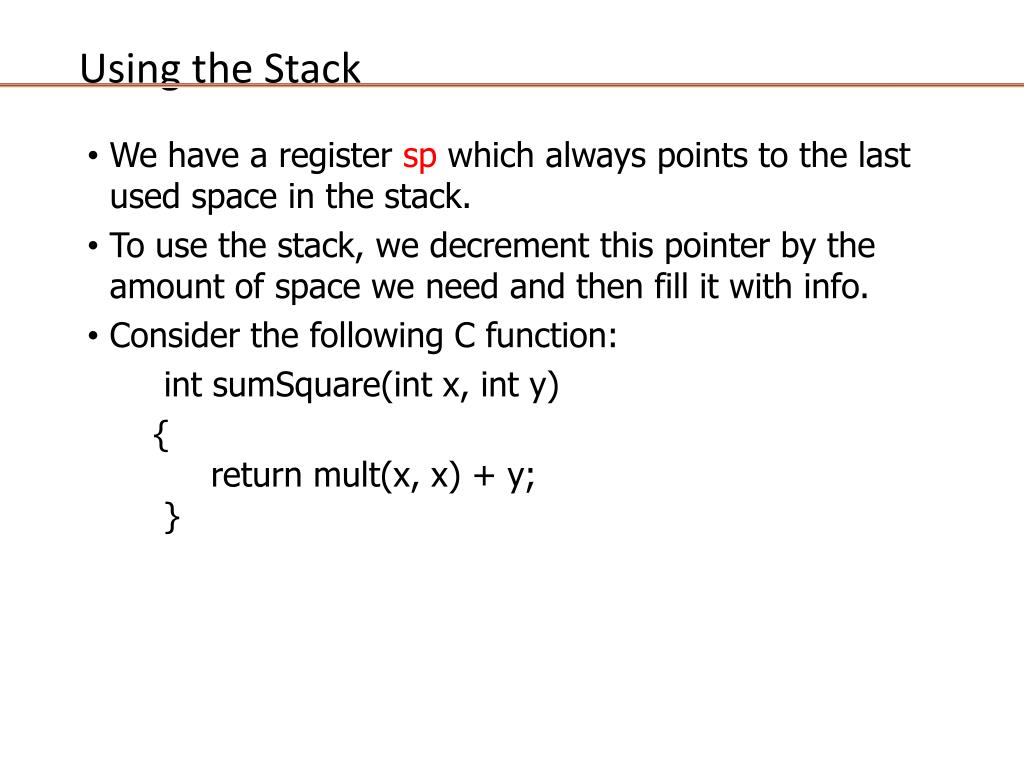 Using the Stack • We have a register sp which always points to the last used space in the stack. • To use the stack, we decrement this pointer by the amount of space we need and then fill it with info. • Consider the following C function: intsumSquare(int x, int y) { return mult(x, x) + y;}