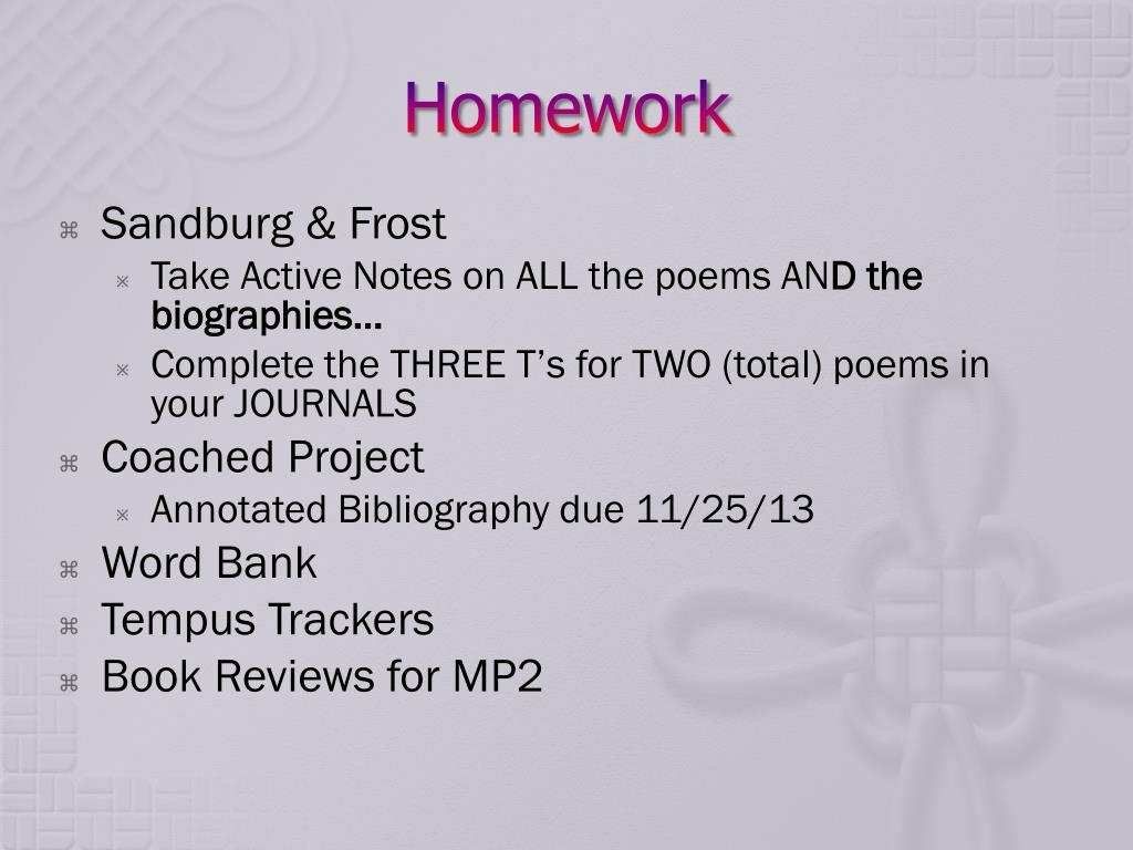 Homework • Sandburg & Frost • Take Active Notes on ALL the poems AND the biographies… • Complete the THREE T’s for TWO (total) poems in your JOURNALS • Coached Project • Annotated Bibliography due 11/25/13 • Word Bank • Tempus Trackers • Book Reviews for MP2