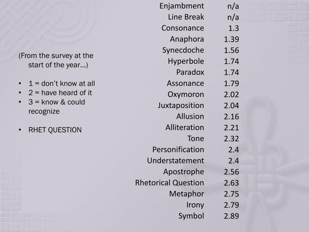 (From the survey at the start of the year…) • 1 = don’t know at all • 2 = have heard of it • 3 = know & could recognize • RHET QUESTION