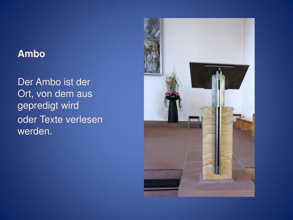 Ambo Der Ambo ist der Ort, von dem aus gepredigt wird oder Texte verlesen werden.