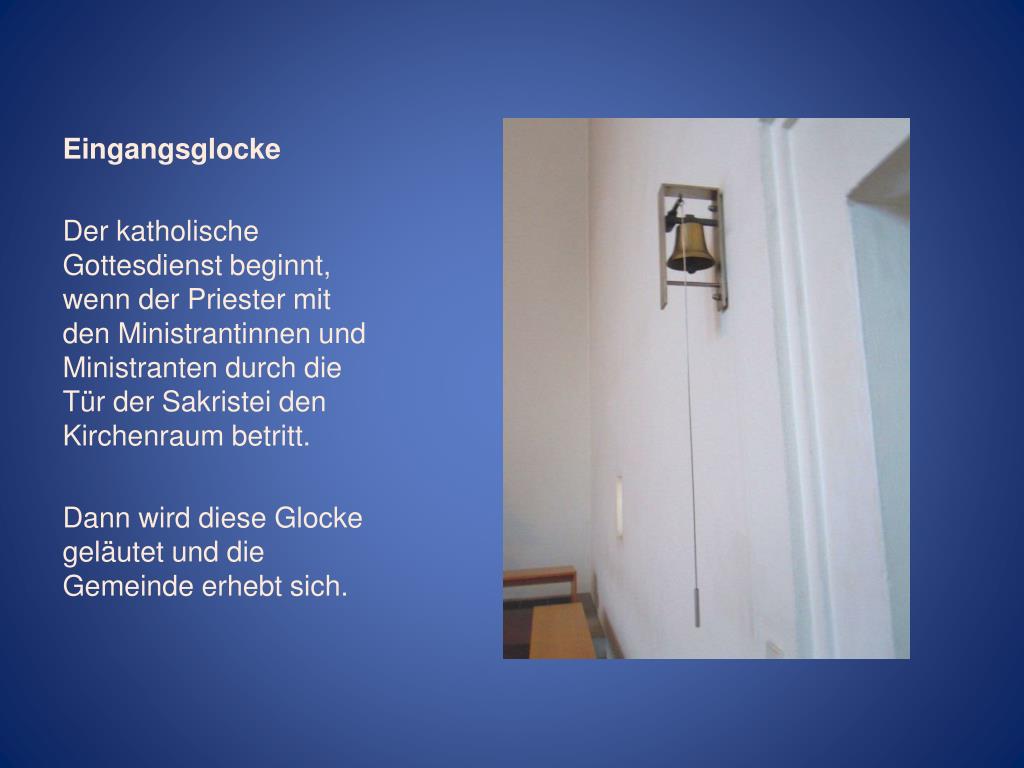 Eingangsglocke Der katholische Gottesdienst beginnt, wenn der Priester mit den Ministrantinnen und Ministranten durch die Tür der Sakristei den Kirchenraum betritt. Dann wird diese Glocke geläutet und die Gemeinde erhebt sich.
