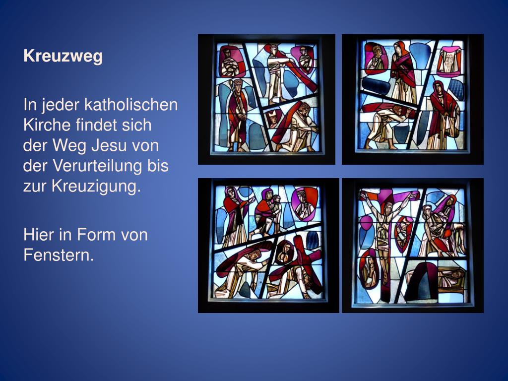 Kreuzweg In jeder katholischen Kirche findet sich der Weg Jesu von der Verurteilung bis zur Kreuzigung. Hier in Form von Fenstern.