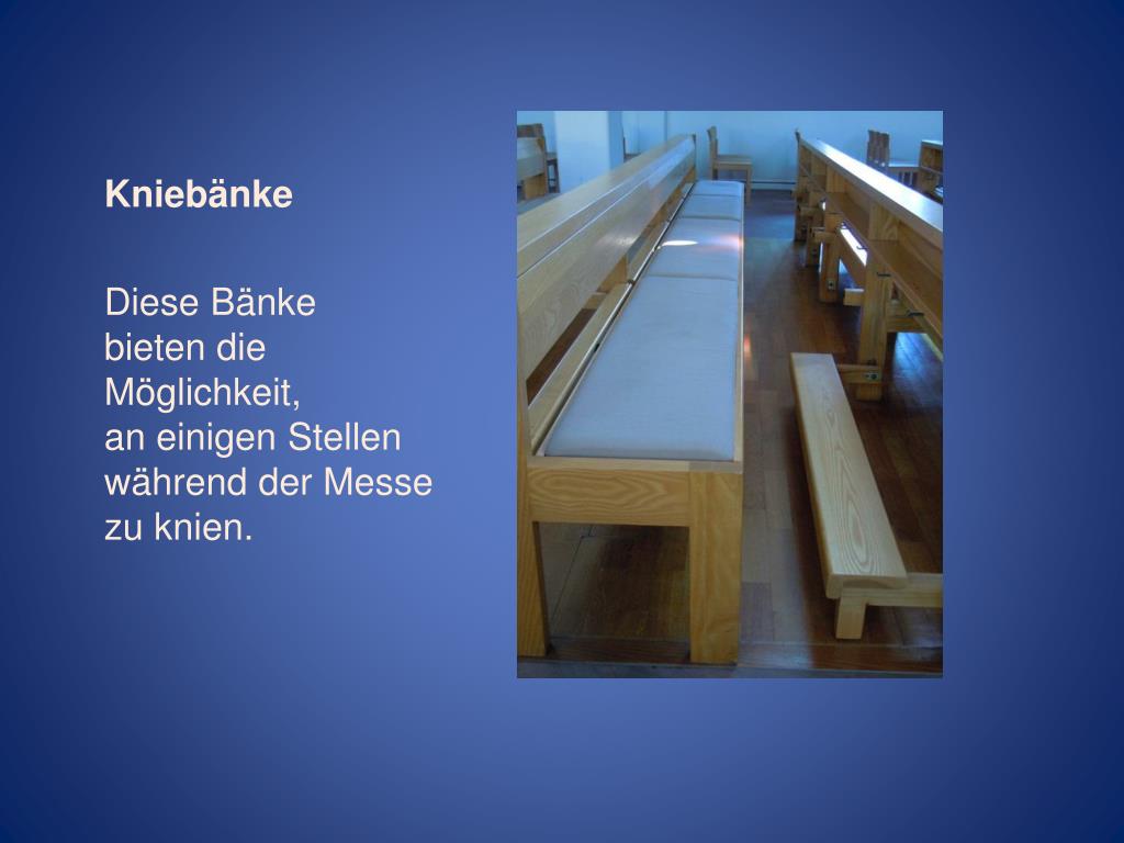 Kniebänke Diese Bänke bieten die Möglichkeit, an einigen Stellen während der Messe zu knien.
