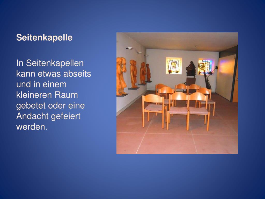 Seitenkapelle In Seitenkapellen kann etwas abseits und in einem kleineren Raum gebetet oder eine Andacht gefeiert werden.