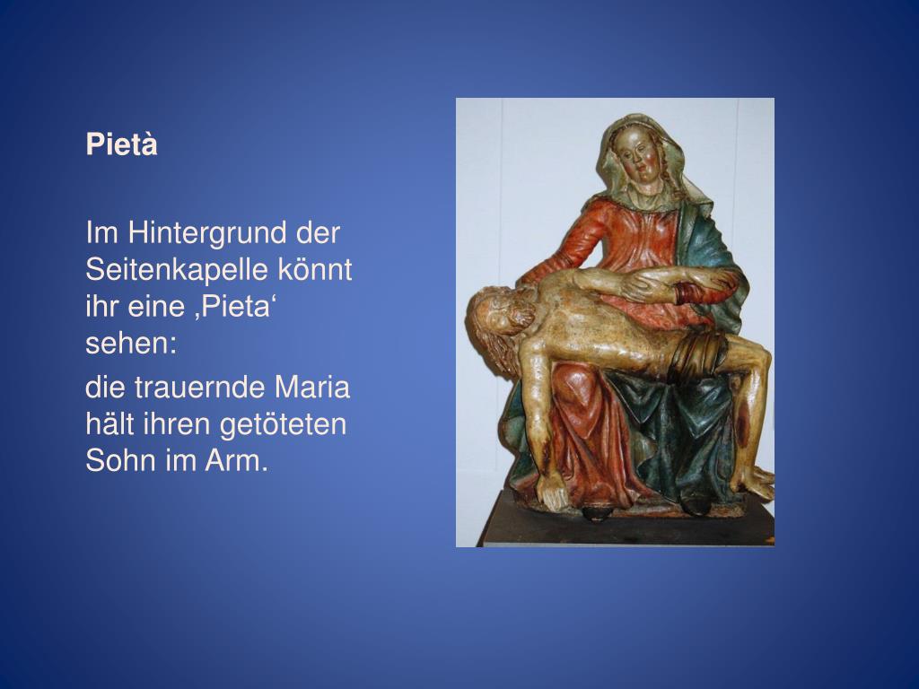 Pietà Im Hintergrund der Seitenkapelle könnt ihr eine ‚Pieta‘ sehen: die trauernde Maria hält ihren getöteten Sohn im Arm.