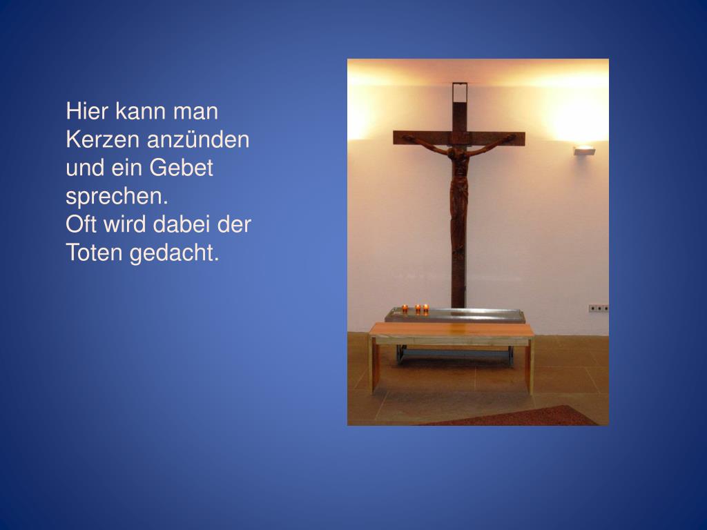 Hier kann man Kerzen anzünden und ein Gebet sprechen. Oft wird dabei der Toten gedacht.