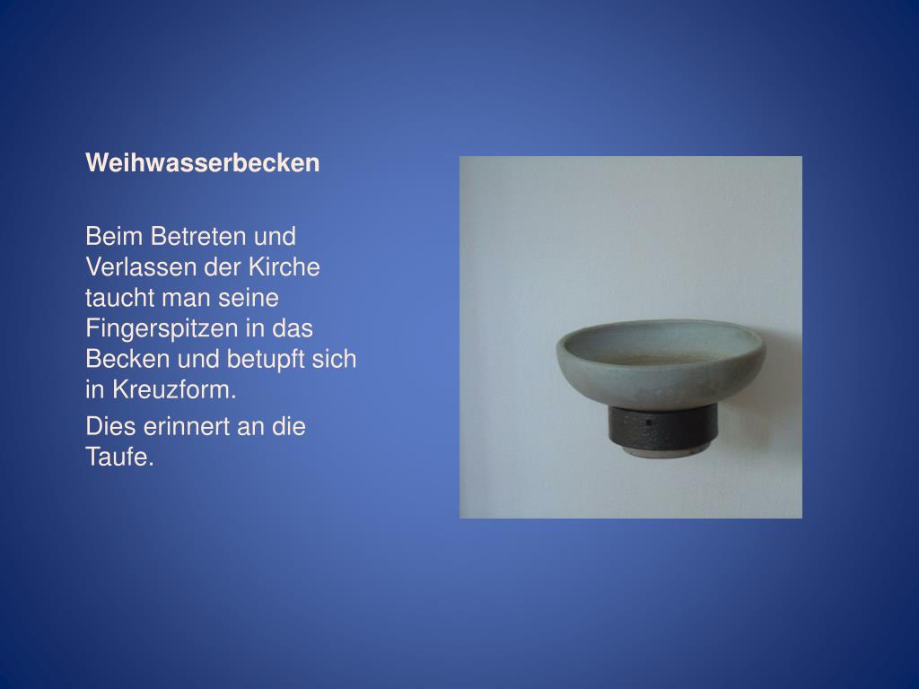 Weihwasserbecken Beim Betreten und Verlassen der Kirche taucht man seine Fingerspitzen in das Becken und betupft sich in Kreuzform. Dies erinnert an die Taufe.