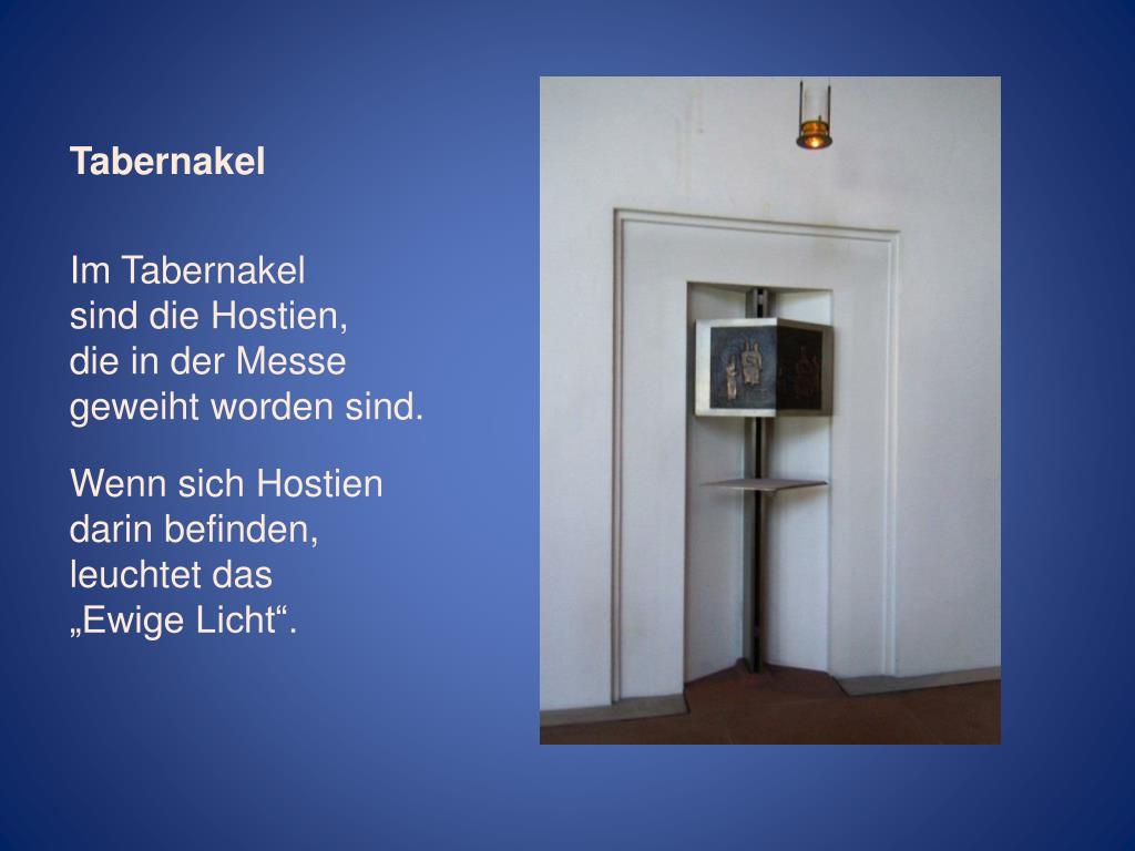 Tabernakel Im Tabernakel sind die Hostien, die in der Messe geweiht worden sind. Wenn sich Hostien darin befinden, leuchtet das „Ewige Licht“.