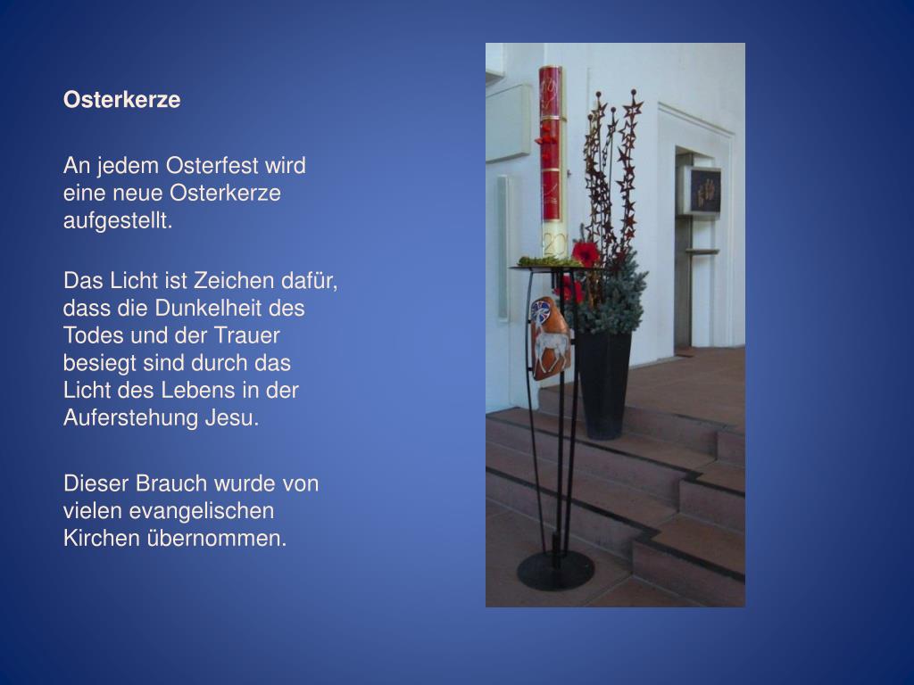 Osterkerze An jedem Osterfest wird eine neue Osterkerze aufgestellt. Das Licht ist Zeichen dafür, dass die Dunkelheit des Todes und der Trauer besiegt sind durch das Licht des Lebens in der Auferstehung Jesu. Dieser Brauch wurde von vielen evangelischen Kirchen übernommen.