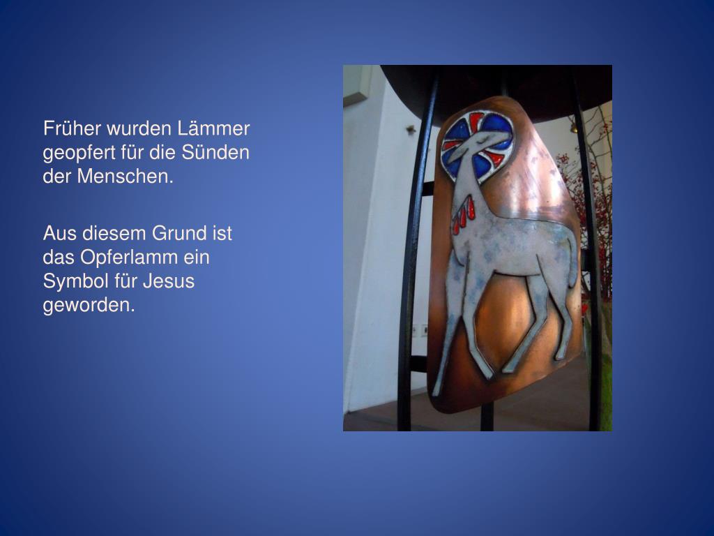 Früher wurden Lämmer geopfert für die Sünden der Menschen. Aus diesem Grund ist das Opferlamm ein Symbol für Jesus geworden.