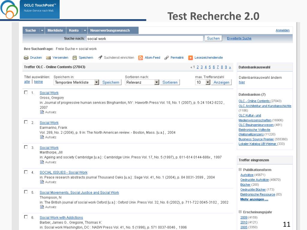 Test Recherche2.0 Personalisierungsfunktionen Fachportale Suchoptionen bibliotheksspezifische Angebote Vorauswahl Datenbanken 10