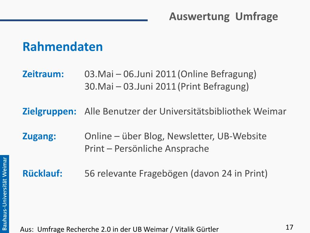 Auswertung Umfrage Rahmendaten Zeitraum:03.Mai – 06.Juni 2011 (Online Befragung) 30.Mai – 03.Juni 2011 (Print Befragung) Zielgruppen:Alle Benutzer der Universitätsbibliothek Weimar Zugang:Online – über Blog, Newsletter, UB-Website Print – Persönliche Ansprache Rücklauf:56 relevante Fragebögen (davon 24 in Print) 17 Aus: Umfrage Recherche 2.0 in der UB Weimar / Vitalik Gürtler