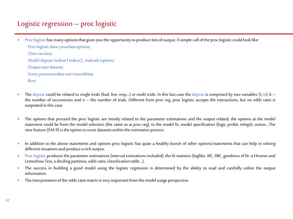 Proc logistic – the output • The following is a simplified example of the output from a call to proc logistic:
