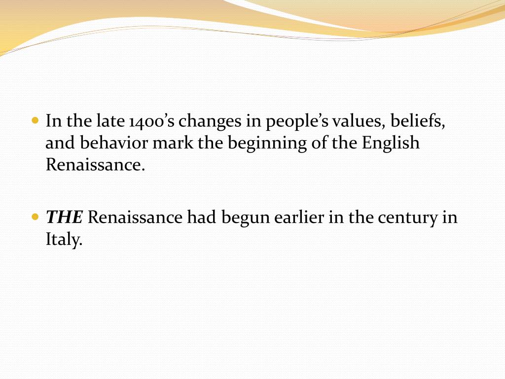 In the late 1400’s changes in people’s values, beliefs, and behavior mark the beginning of the English Renaissance. • THE Renaissance had begun earlier in the century in Italy.
