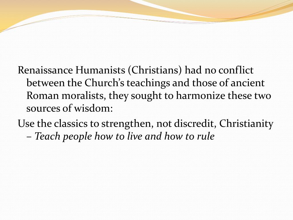 Renaissance Humanists (Christians) had no conflict between the Church’s teachings and those of ancient Roman moralists, they sought to harmonize these two sources of wisdom: Use the classics to strengthen, not discredit, Christianity – Teach people how to live and how to rule