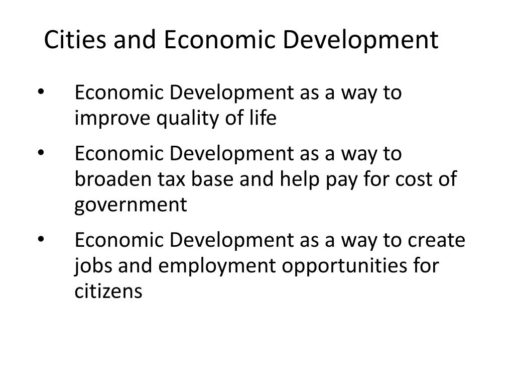 Cities and Economic Development • Economic Development as a way to improve quality of life • Economic Development as a way to broaden tax base and help pay for cost of government • Economic Development as a way to create jobs and employment opportunities for citizens