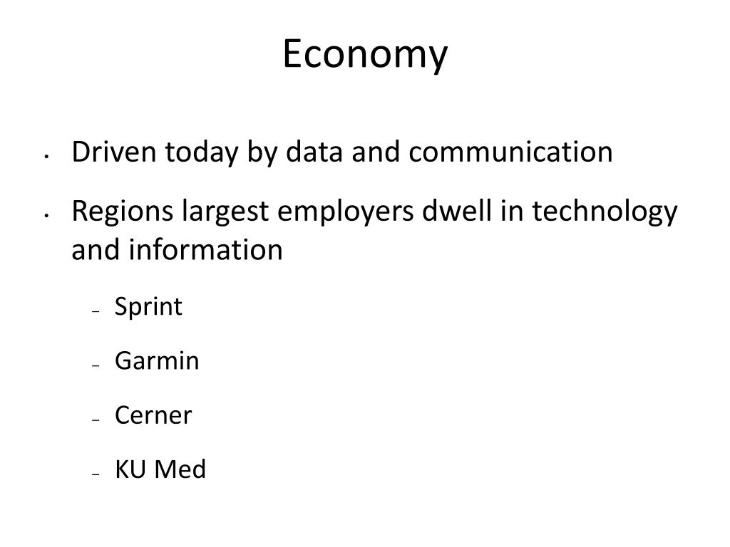 Economy • Driven today by data and communication • Regions largest employers dwell in technology and information • Sprint • Garmin • Cerner • KU Med
