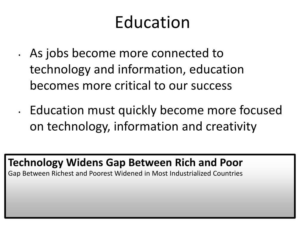 Education • As jobs become more connected to technology and information, education becomes more critical to our success • Education must quickly become more focused on technology, information and creativity Technology Widens Gap Between Rich and Poor Gap Between Richest and Poorest Widened in Most Industrialized Countries