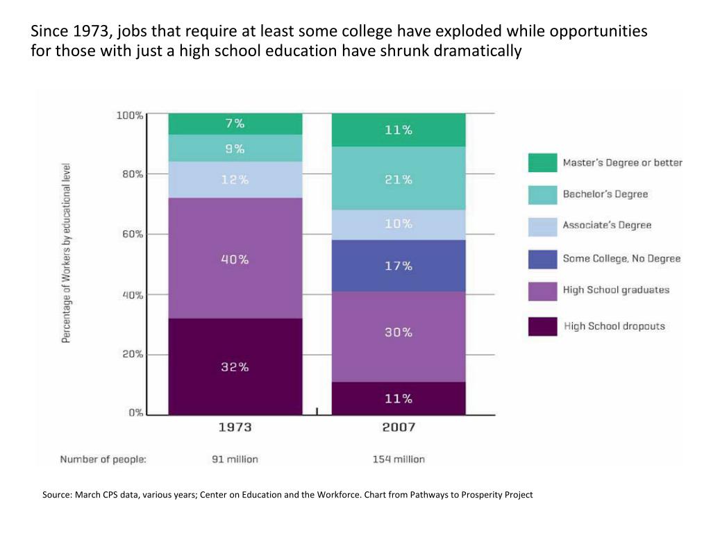 Harvard Study slide Since 1973, jobs that require at least some college have exploded while opportunities for those with just a high school education have shrunk dramatically Source: March CPS data, various years; Center on Education and the Workforce. Chart from Pathways to Prosperity Project