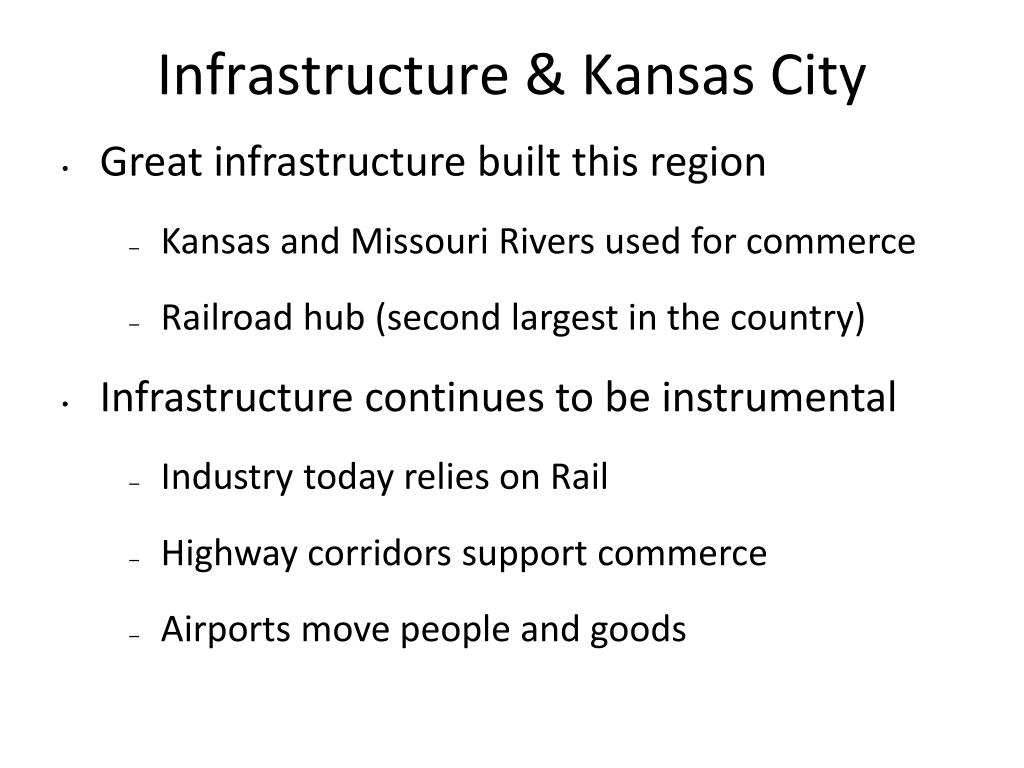 Infrastructure & Kansas City • Great infrastructure built this region • Kansas and Missouri Rivers used for commerce • Railroad hub (second largest in the country) • Infrastructure continues to be instrumental • Industry today relies on Rail • Highway corridors support commerce • Airports move people and goods