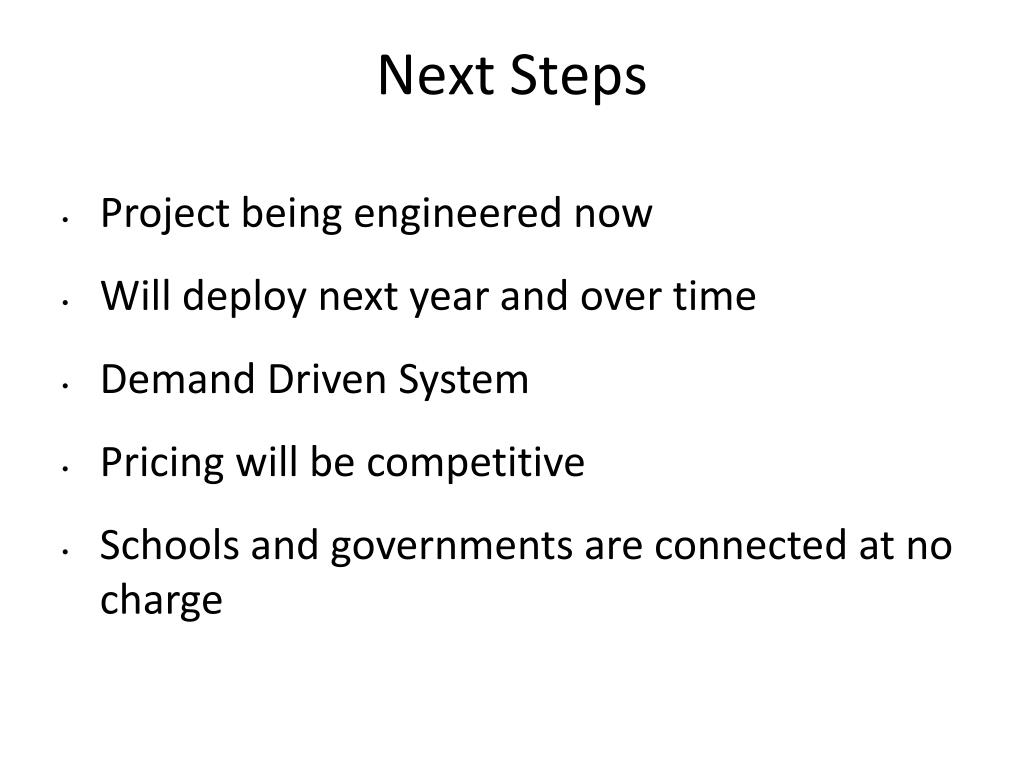 Next Steps • Project being engineered now • Will deploy next year and over time • Demand Driven System • Pricing will be competitive • Schools and governments are connected at no charge