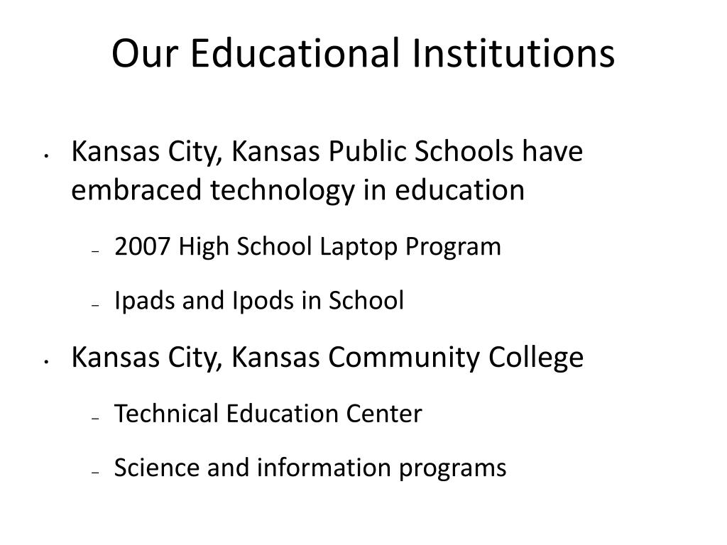 Our Educational Institutions • Kansas City, Kansas Public Schools have embraced technology in education • 2007 High School Laptop Program • Ipads and Ipods in School • Kansas City, Kansas Community College • Technical Education Center • Science and information programs
