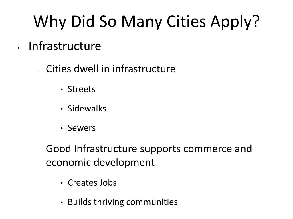 Why Did So Many Cities Apply? • Infrastructure • Cities dwell in infrastructure • Streets • Sidewalks • Sewers • Good Infrastructure supports commerce and economic development • Creates Jobs • Builds thriving communities