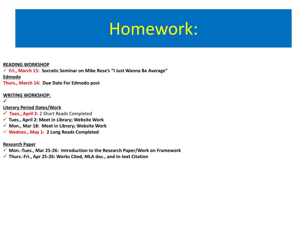 Homework: • READING WORKSHOP • Fri., March 15: Socratic Seminar on Mike Rose’s “I Just Wanna Be Average” • Edmodo • Thurs., March 14: Due Date For Edmodo post • WRITING WORKSHOP: • • Literary Period Dates/Work • Tues., April 2: 2 Short Reads Completed • Tues., April 2: Meet in Library; Website Work • Mon., Mar 18: Meet in Library; Website Work • Wednes., May 1: 2 Long Reads Completed • Research Paper • Mon.-Tues., Mar 25-26: Introduction to the Research Paper/Work on Framework • Thurs.-Fri., Apr 25-26: Works Cited, MLA doc., and In-text Citation