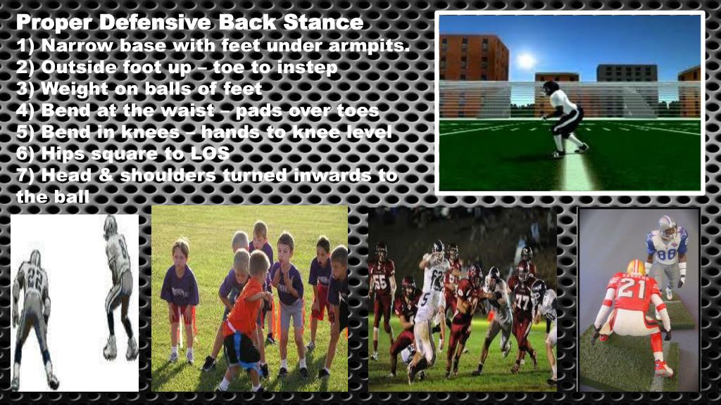 Proper Defensive Back Stance 1) Narrow base with feet under armpits. 2) Outside foot up – toe to instep 3) Weight on balls of feet 4) Bend at the waist – pads over toes 5) Bend in knees – hands to knee level 6) Hips square to LOS 7) Head & shoulders turned inwards to the ball