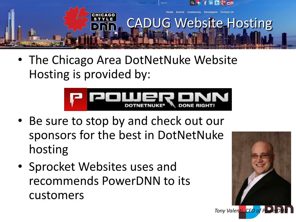 CADUG Website Hosting • The Chicago Area DotNetNuke Website Hosting is provided by: • Be sure to stop by and check out our sponsors for the best in DotNetNuke hosting • Sprocket Websites uses and recommends PowerDNN to its customers Tony Valenti, CEO of PowerDNN