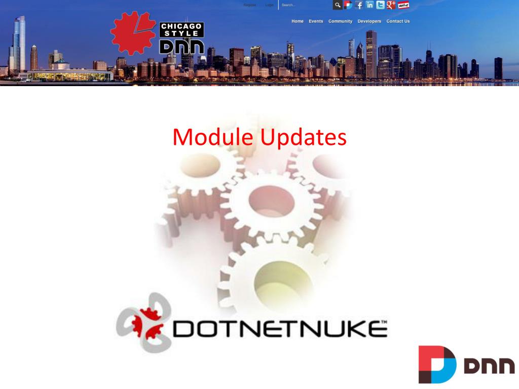 How to get involved • Can you please help us spread the word? • We are social, be sure that you have liked us, followed us, joined us, circled us, etc… • Share, like, retweet, +1 our posts and we will share, like and retweet and +1 your posts as well • Post a message about the Chicago Area DotNetNuke Users group to your Social Media circle of friends, family and neighbors • Tell people about us and help us grow this group