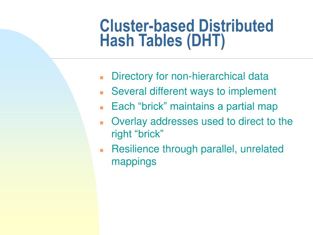 Cluster-based Distributed Hash Tables (DHT) • Directory for non-hierarchical data • Several different ways to implement • Each “brick” maintains a partial map • Overlay addresses used to direct to the right “brick” • Resilience through parallel, unrelated mappings