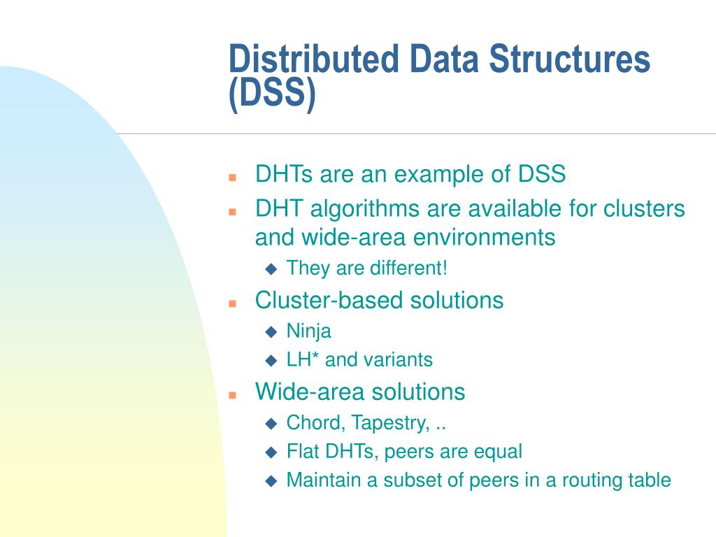 Distributed Data Structures (DSS) • DHTs are an example of DSS • DHT algorithms are available for clusters and wide-area environments • They are different! • Cluster-based solutions • Ninja • LH* and variants • Wide-area solutions • Chord, Tapestry, .. • Flat DHTs, peers are equal • Maintain a subset of peers in a routing table