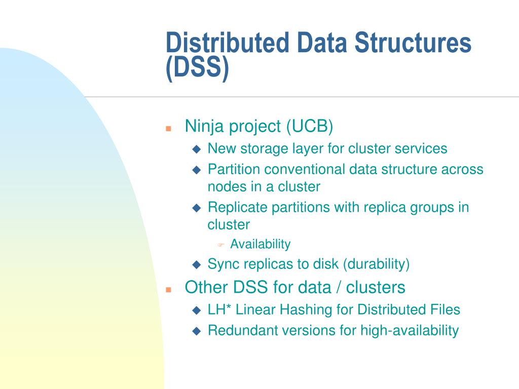 Distributed Data Structures (DSS) • Ninja project (UCB) • New storage layer for cluster services • Partition conventional data structure across nodes in a cluster • Replicate partitions with replica groups in cluster • Availability • Sync replicas to disk (durability) • Other DSS for data / clusters • LH* Linear Hashing for Distributed Files • Redundant versions for high-availability