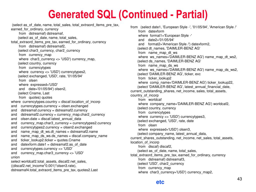 Generated SQL (1st Part) select worldcaf.total_assets, discaf.net_sales, ((discaf.net_income*0.001)*olsen.rate), (dstreamaf2.total_extraord_items_pre_tax*olsen2.rate), quotes.Last from (select date1, 'European Style -', '01/05/94', 'American Style /' from datexform where format1='European Style -' and date2='01/05/94' and format2='American Style /') datexform, (select dt_names, 'DAIMLER-BENZ AG' from name_map_dt_ws where ws_names='DAIMLER-BENZ AG') name_map_dt_ws, (select ds_names, 'DAIMLER-BENZ AG' from name_map_ds_ws where ws_names='DAIMLER-BENZ AG') name_map_ds_ws, (select 'DAIMLER-BENZ AG', ticker, exc from ticker_lookup2 where comp_name='DAIMLER-BENZ AG') ticker_lookup2, (select 'DAIMLER-BENZ AG', latest_annual_financial_date, current_outstanding_shares, net_income, sales, total_assets, country_of_incorp from worldcaf where company_name='DAIMLER-BENZ AG') worldcaf, (select country, currency from currencytypes where currency <> 'USD') currencytypes, (select exchanged, 'USD', rate, date from olsen where expressed='USD') olsen, (select company_name, latest_annual_data, current_shares_outstanding, net_income, net_sales, total_assets, location_of_incorp from discaf) discaf,