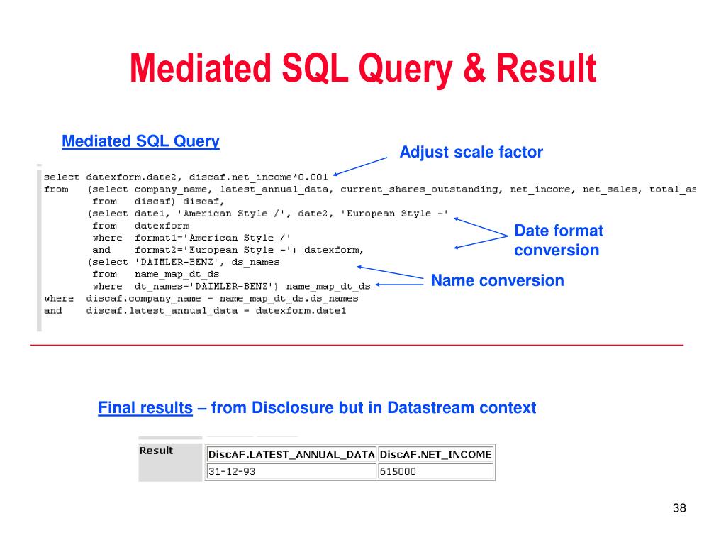 Mediated SQL Query & Result Mediated SQL Query Adjust scale factor Date format conversion Name conversion Final results – from Disclosure but in Datastream context