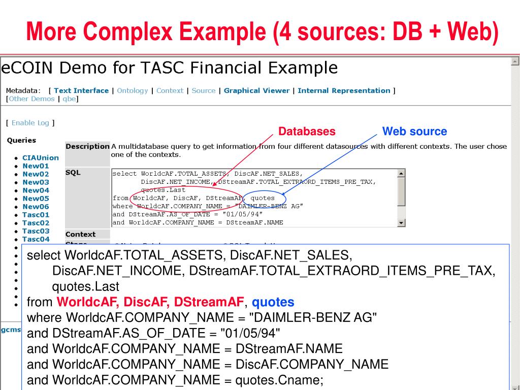 Generated SQL (Continued - Partial) (select as_of_date, name, total_sales, total_extraord_items_pre_tax, earned_for_ordinary, currency from dstreamaf) dstreamaf, (select as_of_date, name, total_sales, total_extraord_items_pre_tax, earned_for_ordinary, currency from dstreamaf) dstreamaf2, (select char3_currency, char2_currency from currency_map where char3_currency <> 'USD') currency_map, (select country, currency from currencytypes where currency <> 'USD') currencytypes2, (select exchanged, 'USD', rate, '01/05/94' from olsen where expressed='USD' and date='01/05/94') olsen2, (select Cname, Last from quotes) quotes where currencytypes.country = discaf.location_of_incorp and currencytypes.currency = olsen.exchanged and dstreamaf.currency = dstreamaf2.currency and dstreamaf2.currency = currency_map.char2_currency and olsen.date = discaf.latest_annual_data and currency_map.char3_currency = currencytypes2.currency and currencytypes2.currency = olsen2.exchanged and name_map_dt_ws.dt_names = dstreamaf2.name and name_map_ds_ws.ds_names = discaf.company_name and ticker_lookup2.ticker = quotes.Cname and datexform.date1 = dstreamaf2.as_of_date and currencytypes.currency <> 'USD' and currency_map.char3_currency <> 'USD' union select worldcaf2.total_assets, discaf2.net_sales, ((discaf2.net_income*0.001)*olsen3.rate), dstreamaf4.total_extraord_items_pre_tax, quotes2.Last from (select date1, 'European Style -', '01/05/94', 'American Style /' from datexform where format1='European Style -' and date2='01/05/94' and format2='American Style /') datexform2, (select dt_names, 'DAIMLER-BENZ AG' from name_map_dt_ws where ws_names='DAIMLER-BENZ AG') name_map_dt_ws2, (select ds_names, 'DAIMLER-BENZ AG' from name_map_ds_ws where ws_names='DAIMLER-BENZ AG') name_map_ds_ws2, (select 'DAIMLER-BENZ AG', ticker, exc from ticker_lookup2 where comp_name='DAIMLER-BENZ AG') ticker_lookup22, (select 'DAIMLER-BENZ AG', latest_annual_financial_date, current_outstanding_shares, net_income, sales, total_assets, country_of_incorp from worldcaf where company_name='DAIMLER-BENZ AG') worldcaf2, (select country, currency from currencytypes where currency <> 'USD') currencytypes3, (select exchanged, 'USD', rate, date from olsen where expressed='USD') olsen3, (select company_name, latest_annual_data, current_shares_outstanding, net_income, net_sales, total_assets, location_of_incorp from discaf) discaf2, (select as_of_date, name, total_sales, total_extraord_items_pre_tax, earned_for_ordinary, currency from dstreamaf) dstreamaf3, (select 'USD', char2_currency from currency_map where char3_currency='USD') currency_map2, etc