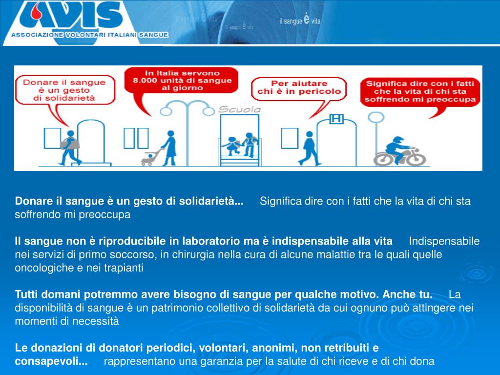 Donare il sangue è un gesto di solidarietà... Significa dire con i fatti che la vita di chi sta soffrendo mi preoccupa Il sangue non è riproducibile in laboratorio ma è indispensabile alla vita Indispensabile nei servizi di primo soccorso, in chirurgia nella cura di alcune malattie tra le quali quelle oncologiche e nei trapianti Tutti domani potremmo avere bisogno di sangue per qualche motivo. Anche tu. La disponibilità di sangue è un patrimonio collettivo di solidarietà da cui ognuno può attingere nei momenti di necessità Le donazioni di donatori periodici, volontari, anonimi, non retribuiti e consapevoli... rappresentano una garanzia per la salute di chi riceve e di chi dona