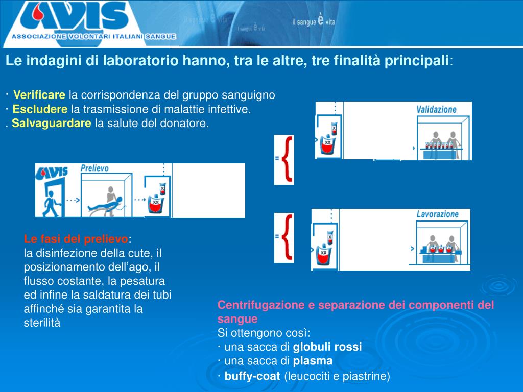 Le indagini di laboratorio hanno, tra le altre, tre finalità principali:· Verificare la corrispondenza del gruppo sanguigno · Escludere la trasmissione di malattie infettive. . Salvaguardare la salute del donatore. Le fasi del prelievo:la disinfezione della cute, il posizionamento dell’ago, il flusso costante, la pesatura ed infine la saldatura dei tubi affinché sia garantita la sterilità Centrifugazione e separazione dei componenti del sangueSi ottengono così:· una sacca di globuli rossi· una sacca di plasma· buffy-coat (leucociti e piastrine)