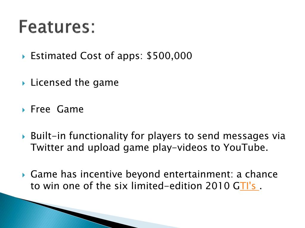 Features: • Estimated Cost of apps: $500,000 • Licensed the game • Free Game • Built-in functionality for players to send messages via Twitter and upload game play-videos to YouTube. • Game has incentive beyond entertainment: a chance to win one of the six limited-edition 2010 GTI's .