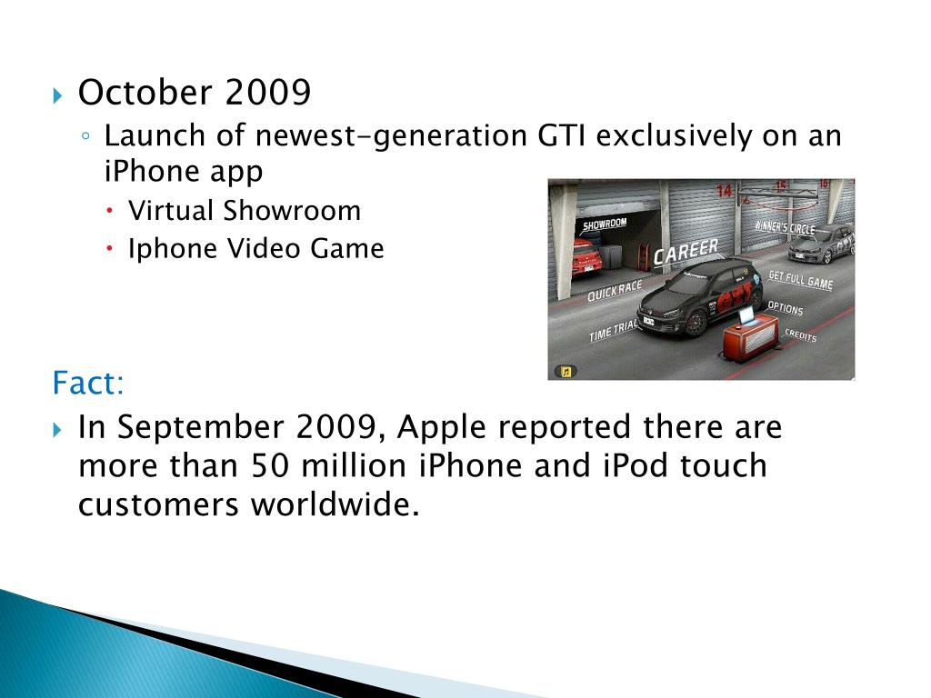 October 2009 • Launch of newest-generation GTI exclusively on an iPhone app • Virtual Showroom • Iphone Video Game Fact: • In September 2009, Apple reported there are more than 50 million iPhone and iPod touch customers worldwide.