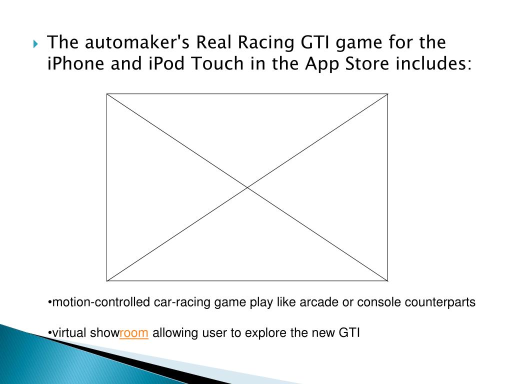 The automaker's Real Racing GTI game for the iPhone and iPod Touch in the App Store includes: • motion-controlled car-racing game play like arcade or console counterparts • virtual showroom allowing user to explore the new GTI