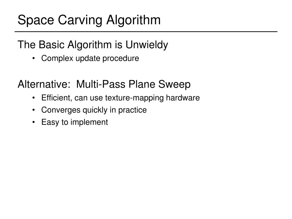 Space Carving Algorithm The Basic Algorithm is Unwieldy • Complex update procedure Alternative: Multi-Pass Plane Sweep • Efficient, can use texture-mapping hardware • Converges quickly in practice • Easy to implement Results Algorithm